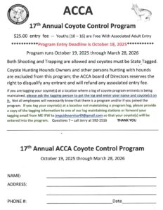 Registration for the 2025-26 Coyote Control Program is due, October 18. Program runs from October 19 thru March 28, 2026.